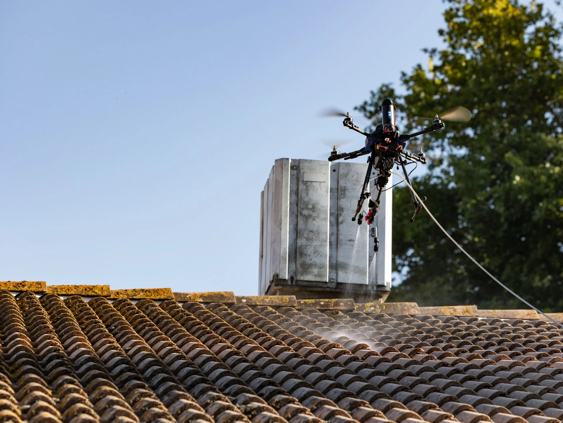 Le drone permet de démousser tous types de surfaces (m²) et de revêtements (toit en tuile, ardoise, ciment, fibro, etc.) sans aucun contact avec le toit, sans échelles ni échafaudages (préservant votre toit, vos gouttières et vos pelouses), aucun n’accès n’est impossible pour lui. L’impact environnemental est faible (utilisation de produits biodégradables et des ressources raisonnées : pas de gaspillage).